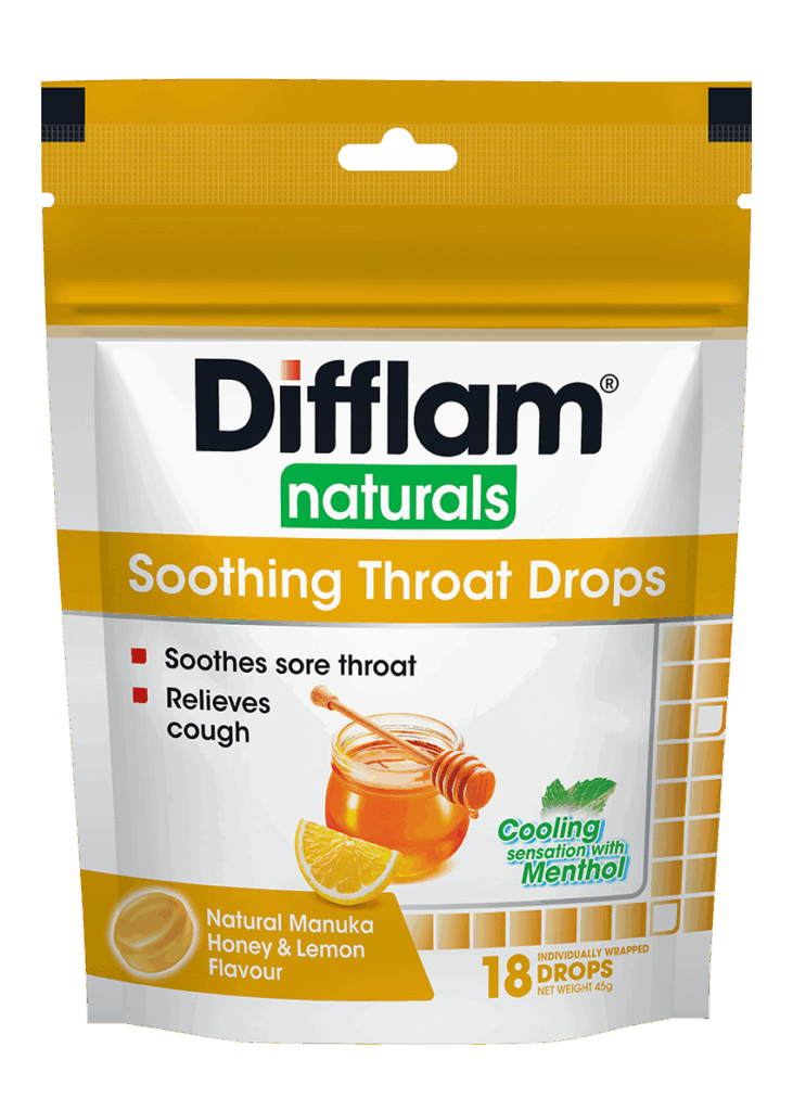 Pack of 16 individually wrapped drops Pack of 8 individually wrapped drops Difflam Naturals Soothing Throat Drops